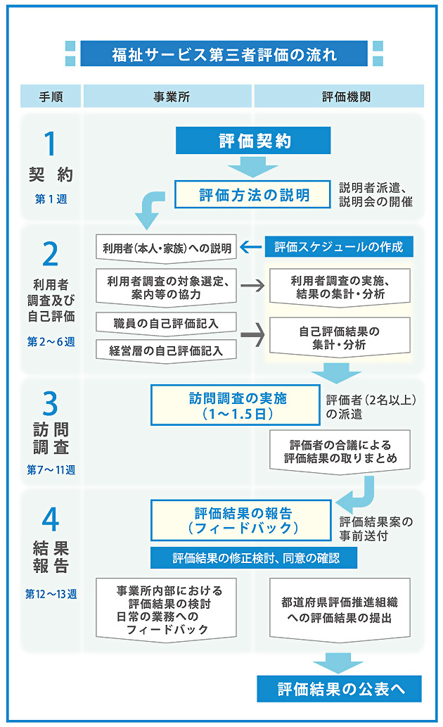 自己評価は、所定の評価項目に沿って自らの経営面とサービス提供面をチェックし、 良い点や改善点についても評価します。なお、職員の自己評価については匿名で行います。評価チームが利用者調査と自己評価の結果を集計・分析した上で訪問調査を実施し、現場の実際の状況等について経営層・職員に対するヒアリングと文書・記録等の確認を行います。